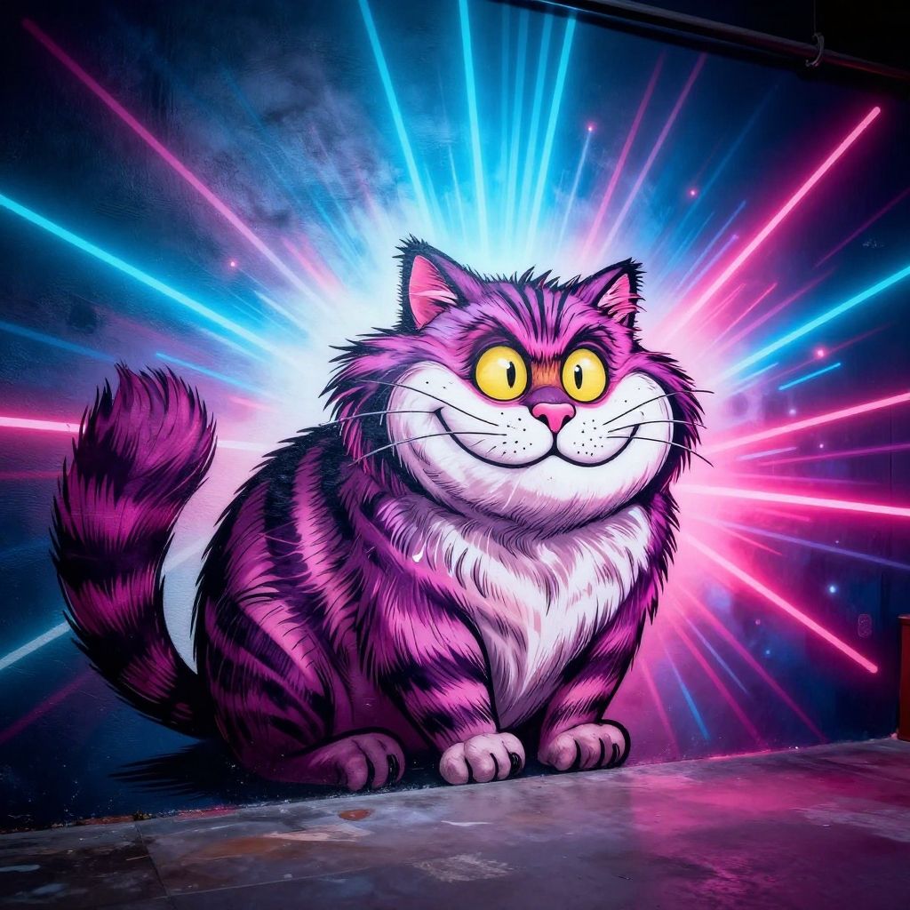 ((best quality)), ((detailed)), ((masterpiece)), ((Enchanting)), Phenomenal, Exquisite, (((wall graffiti drawing:1.3) of Cheshire Cat, (Wall Graffiti:1.3), (Graffiti:1.2))) artwork, flat shading, (influenced by banksy), Lateral illumination, Off-axis lighting, Directional light, Panoramic view, Wide angle, (neon stripes:1.1), neon background, (glowing:1.1)(bioluminescence), light rays, (lineart, thick lines, clear lines:1.2), comic, 2d, (straight view:1.2), (Style: realism, (epic:1.2), realistic, photo, trending on artstation, pixar, 3d, ((high quality:1.2, masterpiece:1.2)), (8k resolution), high details, incredibly absurdres, color connection, colorized, colorful), (1girl Wall Graffiti:1.1), (Street art:1.1), Graffiti artwork