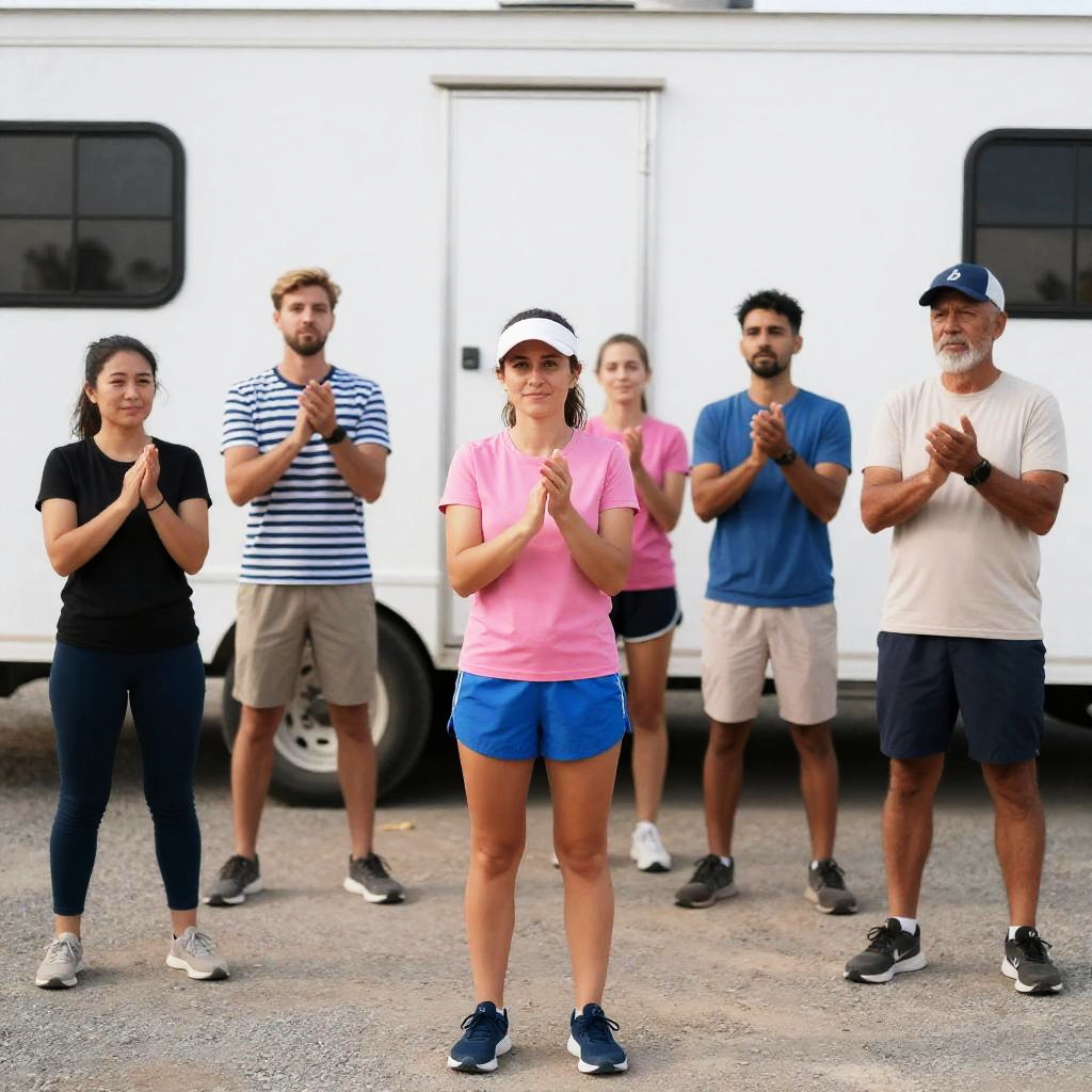 Group of seven people standing in front of a white trailer. Central woman in pink shirt and blue shorts clapping, wearing a visor. Others: woman in black shirt covering mouth, man in striped shirt clapping, woman in pink shirt clapping, man in blue shirt clapping, man in beige shirt standing with hands out, older man in blue shorts and cap. Gravel ground, daytime.
