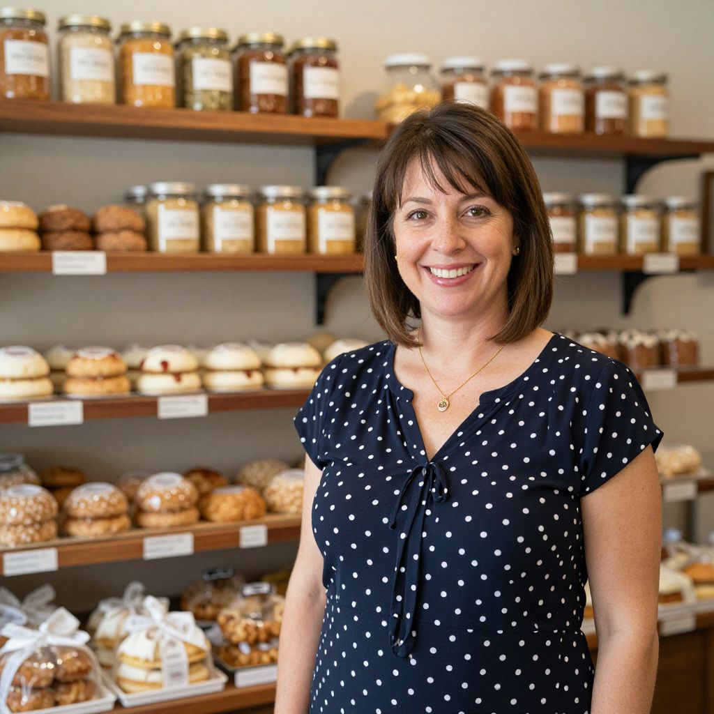 Photograph of a smiling woman with fair skin and straight, shoulder-length dark brown hair. She wears a white, short-sleeved blouse with large black polka dots. The background features wooden shelves filled with various baked goods, including loaves of bread, rolls, and jars of preserves. The shelves are arranged in rows, with small white labels on each item. The woman stands in front of the shelves, centered in the image, and the lighting is bright, enhancing the cheerful atmosphere of the bakery setting.