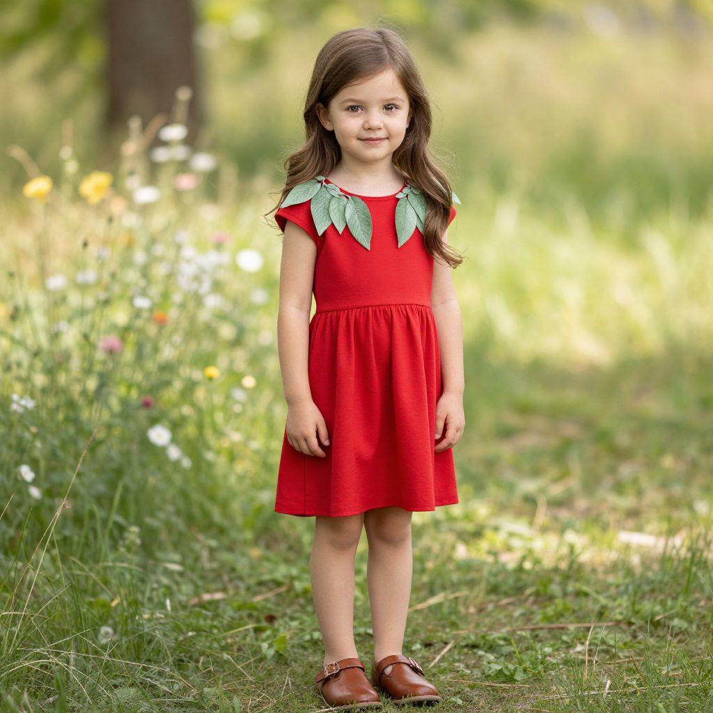 A beautiful young girl stands confidently in a red dress with a delicate green leafy collar that flows gently around her neck, adding a natural, fresh touch to her outfit. She has long, soft brown hair that falls over her shoulders, and her eyes are bright with curiosity and warmth. She wears a pair of comfortable brown leather shoes, completing her elegant yet approachable look. The setting is a sun-dappled meadow with soft green grass and blooming flowers, giving the scene a serene and inviting atmosphere.