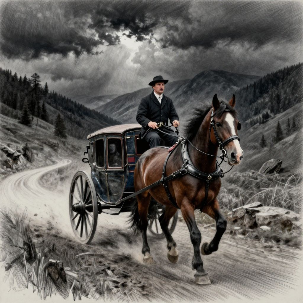 Ultra realistic (full figure:1.4) color pencil drawing of a horse stagecoach at full speed through a mountain pass in Transylvania on a stormy night, Dark theme, dynamic lighting, (stark contrasts), (photo realistic), uhd, 8k