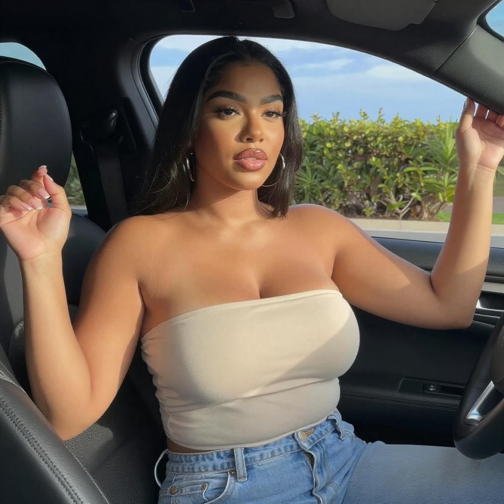 Photograph of a curvy woman with long black hair, tan skin, and full lips, sitting in a car. She wears a strapless beige top and light blue jeans, with sunlight casting shadows on her body. She holds her right hand up, and a green bush and blue sky are visible through the car window in the background.