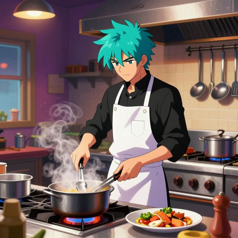 In the heart of a bustling kitchen, a 30-year-old male line cook stands confidently, his attire a blend of practicality and style. He is clad in a white apron, adorned with a single pocket, and a black long-sleeve shirt, both of which contrast sharply with the vibrant colors of the kitchen. His hair, a striking shade of teal, is tousled and wild, adding a touch of rebellion to his appearance. The cook's hands are deftly maneuvering a pair of tongs, skillfully handling a steaming pot, while a plate of food rests on the counter, its contents partially obscured by steam. The kitchen itself is a symphony of colors and textures, with stainless steel appliances gleaming under the overhead lights. Various cooking utensils hang neatly from the wall, their metallic surfaces catching the light. The overall composition is dynamic, with the cook at the center, surrounded by the chaos and energy of the kitchen, yet maintaining a sense of control and focus. The scene is reminiscent of the intricate and imaginative world of Homestuck, with its vibrant colors and detailed textures, and the whimsical style of Arthur Rackham, where fantasy meets reality. The interplay of light and shadow adds depth to the image, highlighting the cook's determination and the complexity of his craft.