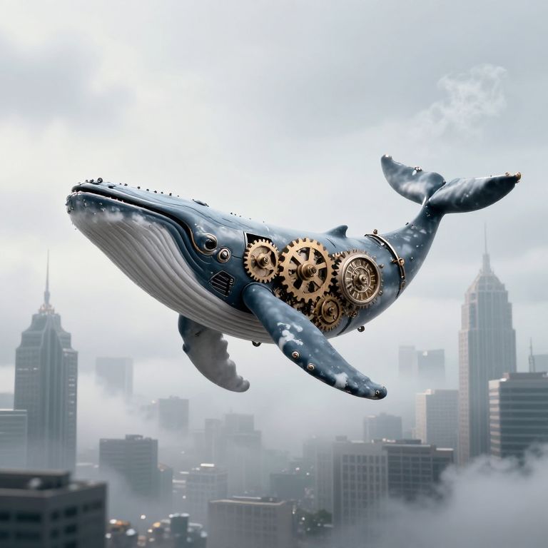 Clockwork whale glides serenely above a fog-shrouded metropolis, its mechanical body adorned with intricate gears and a prominent circular clock face, as plumes of smoke billow from its dorsal vents against a backdrop of towering skyscrapers and ethereal clouds.
