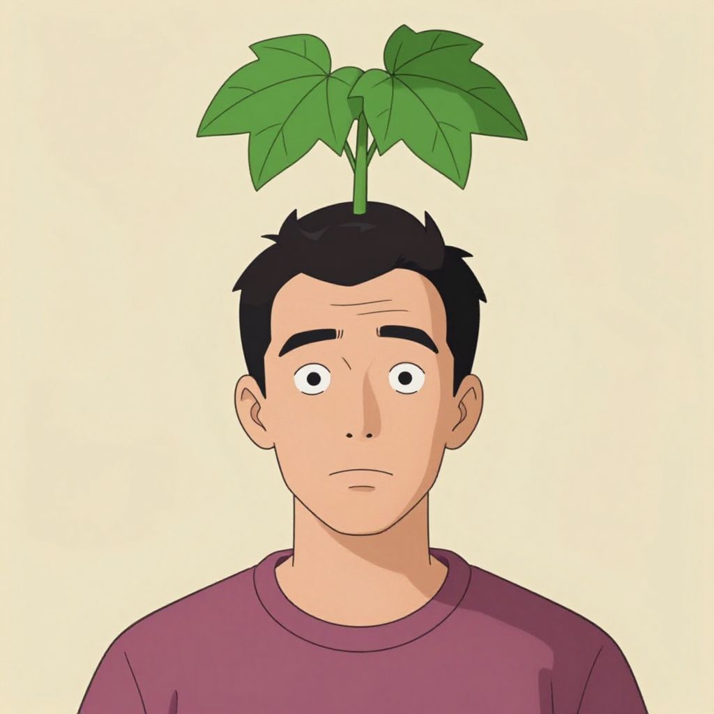 Cartoon illustration of a surprised man with short black hair, wearing a purple shirt, with two green leaves growing from his head.
