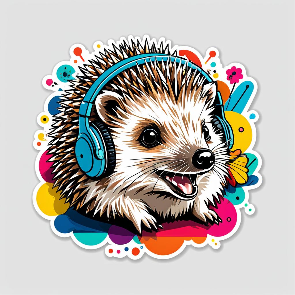 Sticker Bombing an image of a cheerful hedgehog with tiny headphones, vector illustration, a fun and playful scene with bright and colorful abstract shapes, make it realistic, ultra-detailed, very high quality, hyperrealistic, 8k