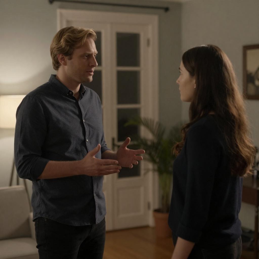 Photograph of a hospital room. Blonde man in green shirt leans over a bed, holding the hand of a woman with brown hair in a white blouse. Man has intense expression, woman looks concerned. Patient with bandaged face lies in bed, eyes closed. Metal hospital bed, red wall, IV stand in background. "20 Miles to Earth" poster.
