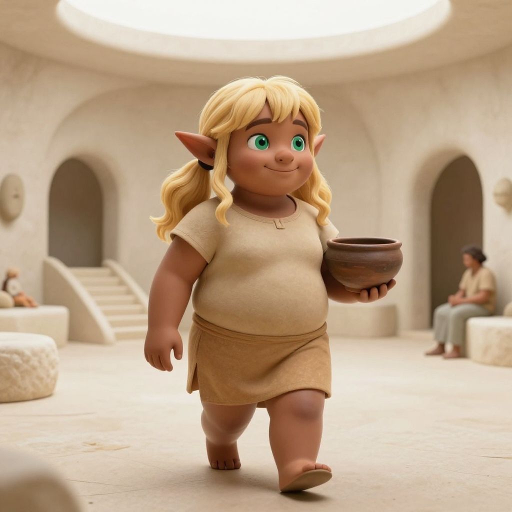 Photorealistic CGI image of a chubby, young female elf with large green eyes, long blonde hair, and pointed ears. She wears a simple beige tunic and skirt, barefoot, and holds a brown ceramic bowl in her right hand. She has a gentle smile. The background features a softly lit, white, circular room with arched doorways and two blurred figures sitting on white, cushioned benches. The setting has a warm, serene atmosphere. The elf's skin is a light brown, contrasting with her bright green eyes.