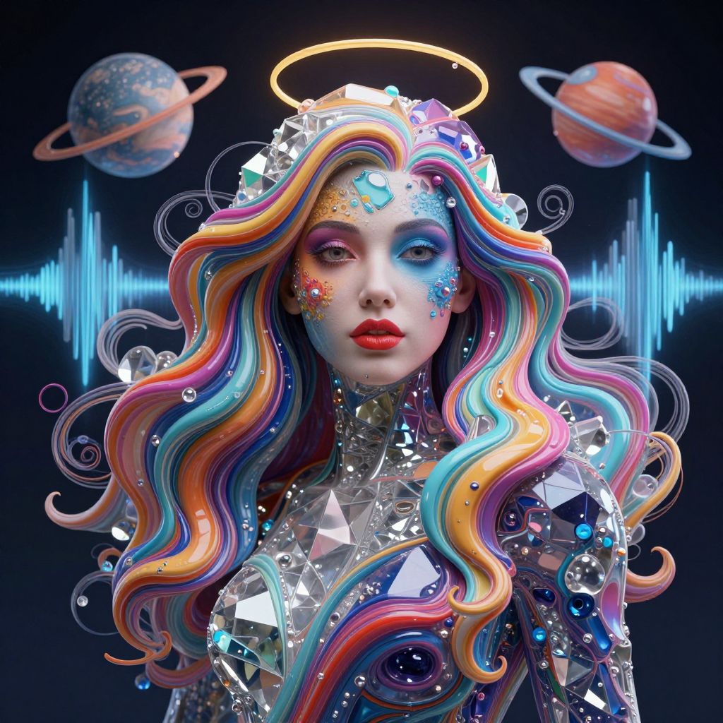 A stunning interpretation of a beautiful woman's form with a vibrant, colorful face and flowing long hair made of epic color palette colored shape-shifting polymers, featuring a crystaline structure, a halo of planets, and sound wave swirls.