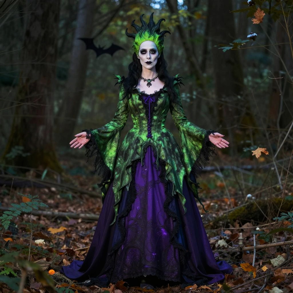 Hocus Pocus Outfit For Halloween, woman in a green dress and purple dress standing in a forest