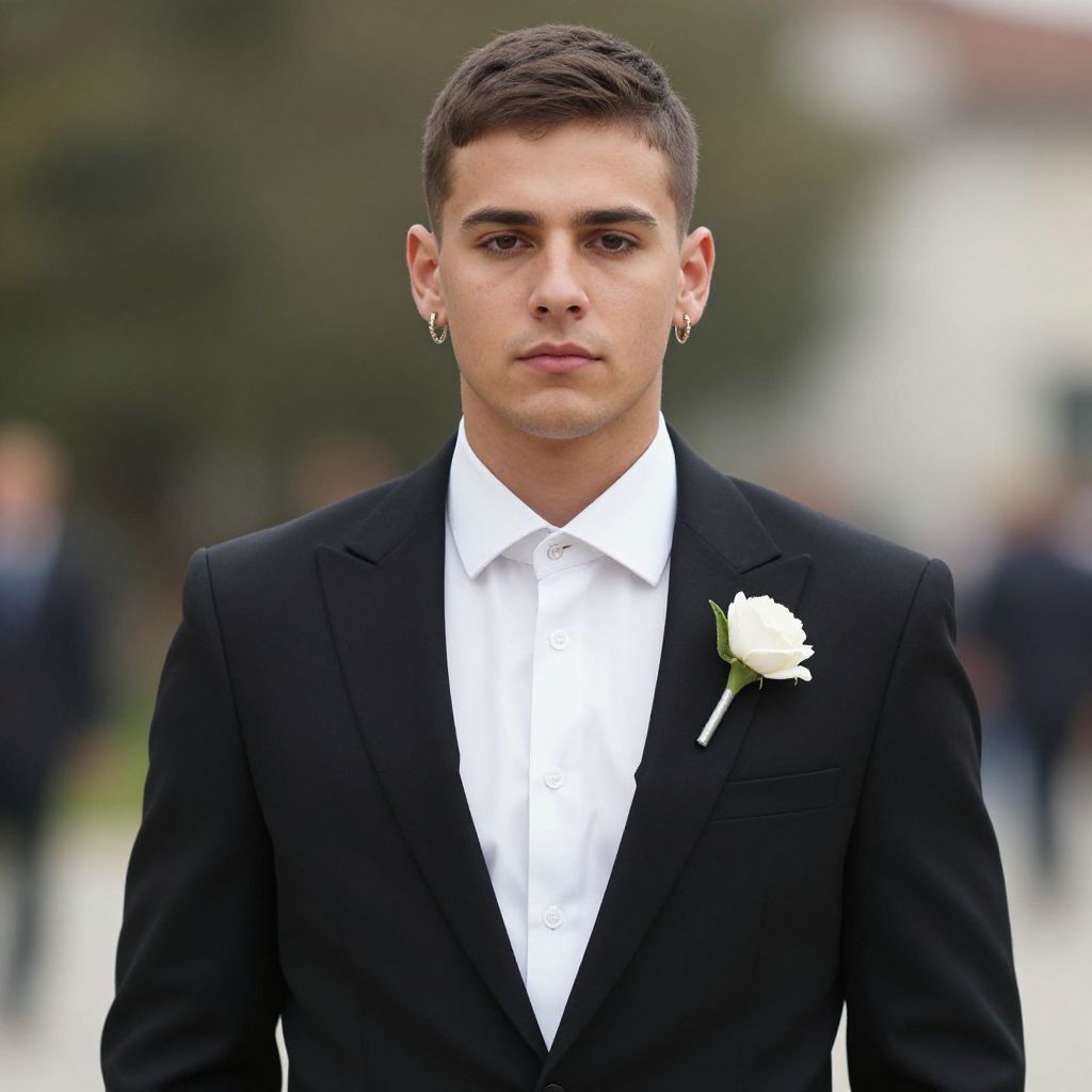 Photograph of a young Caucasian man with short, dark brown hair and fair skin, standing outdoors. He has a serious expression, wears a black suit with a white dress shirt, and a white rose boutonnière pinned to his left lapel. He has small gold hoop earrings in both ears. The background is blurred, showing indistinct greenery and people, suggesting a formal event. The image focuses on his upper body, highlighting his clean, stylish appearance. The overall color palette is muted, with the black suit contrasting against the white shirt and boutonnière.