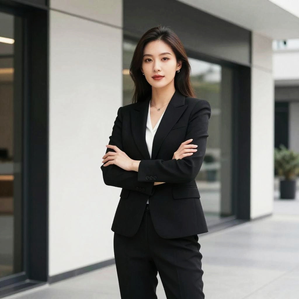Photograph of an Asian woman with long black hair, wearing a black blazer and pants, standing confidently with arms crossed in front of a modern glass