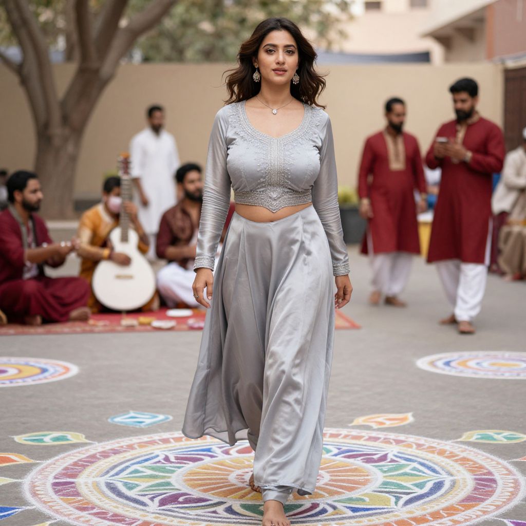 Photograph of a South Asian woman with long black hair, wearing a silver crop top and matching high-waisted pants, walking on a colorful mand