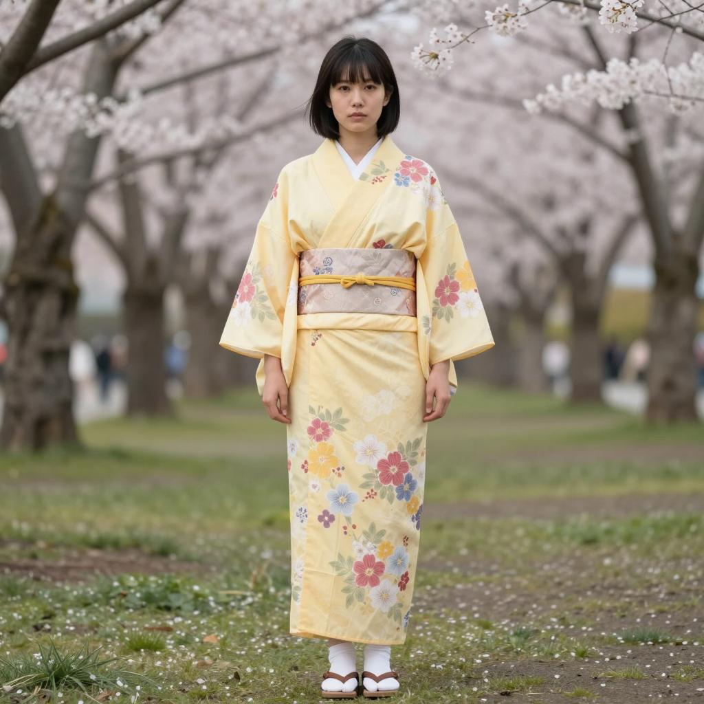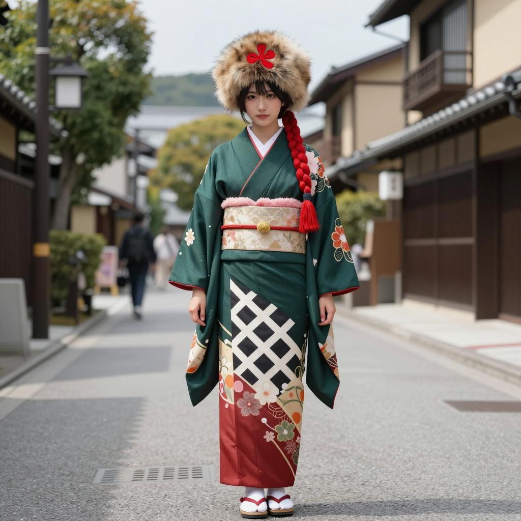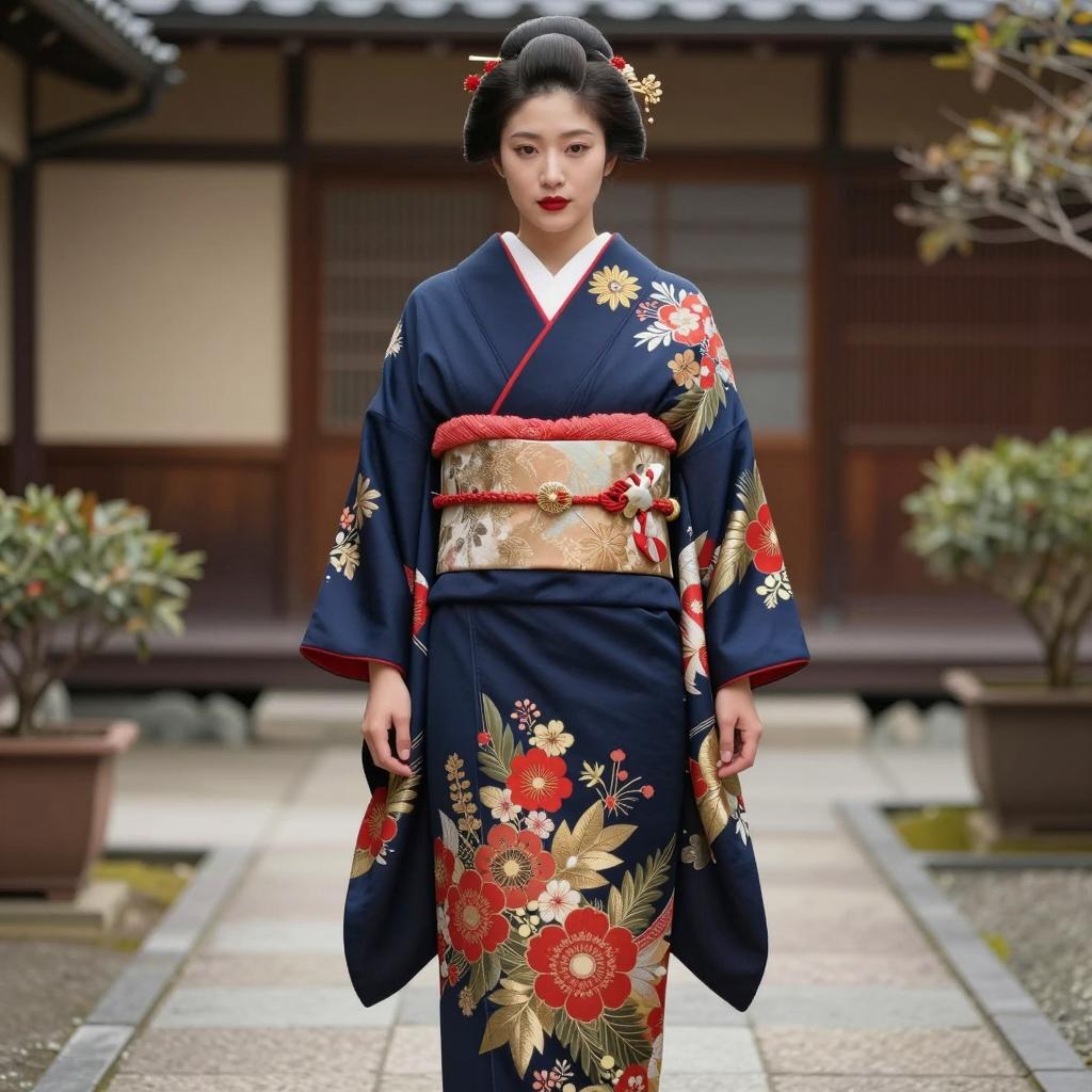 Full body portrait of an Asian woman wearing a traditional Japanese floral kimono with red and blue patterns and a red and blue obi sash. She stands calmly on a stone path in front of a traditional wooden building with a Japanese sign, under warm natural daylight. The woman has black hair styled in a bun with a white hair accessory, and she is wearing traditional sandals. A green leafy plant is visible on the left side of the image.