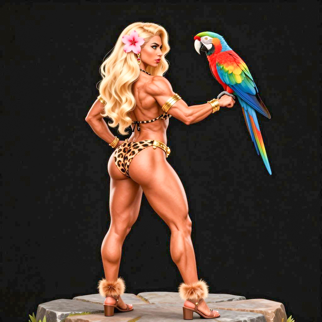 Digital illustration of a muscular woman with tan skin, long wavy blonde hair, and a pink flower in her hair. She wears a leopard-print loincloth, arm and leg bands, and fur-trimmed sandals. She points at a colorful parrot with her right hand. The parrot has vibrant red, blue, yellow, and green feathers. The woman's back is to the viewer, looking over her shoulder. The background is solid black.