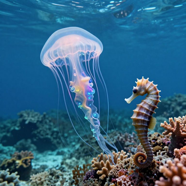 Imagine an expansive digital art composition portraying a tranquil underwater world, skillfully blending the intricate patterns of Japanese ukiyo-e woodblock prints with stunning photorealism. View this captivating scene from the vantage point of a drifting jellyfish, witnessing a vibrant coral reef teeming with diverse marine life - from delicate sea anemone tendrils to graceful manta ray ballets. This visual narrative conveys serene beauty while subtly highlighting the potential threats facing such ecosystems, fostering an emotional spectrum that encourages contemplation on both the awe-inspiring wonder and inherent fragility of nature's underwater domain.