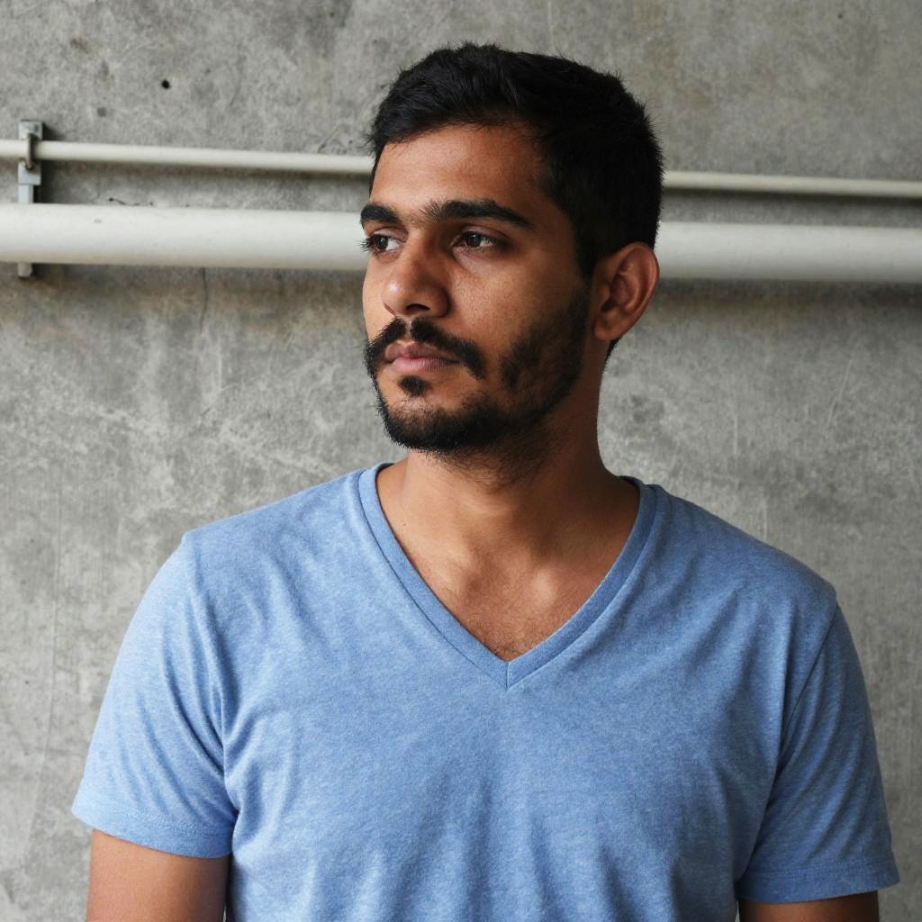 Photograph of a young South Asian man with a medium brown skin tone, short black hair, and a trimmed beard. He's wearing a light blue V-neck t-shirt and looking to the left with a serious expression. The background shows a rough, textured gray concrete wall with visible pipes and some wear. The image has a slightly exaggerated, high-contrast effect.