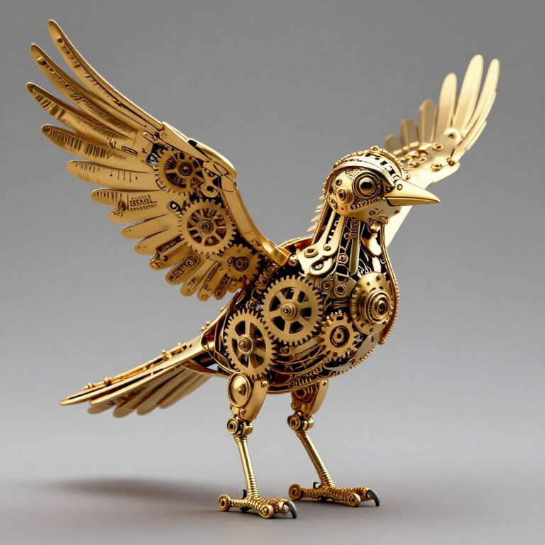 A steampunk-inspired bird, intricately crafted from polished gold cogs and gears, stands poised as if ready to take flight, its mechanical form defying the boundaries between nature and machinery.