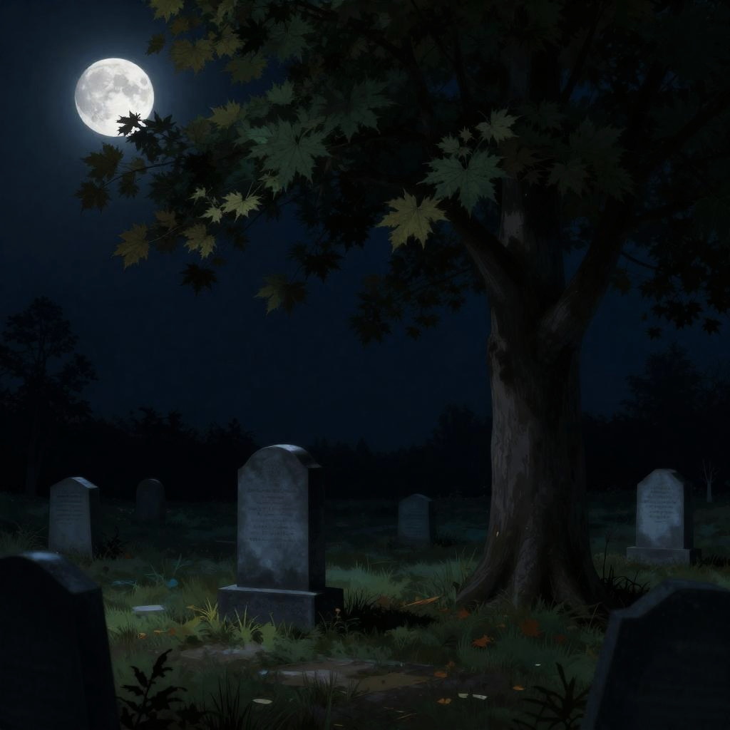 A lonely graveyard at night, with moonlight falling on a specific grave beneath a mahogany tree, by Aleksandra Waliszewska, high-detail concept art, cinematic atmosphere