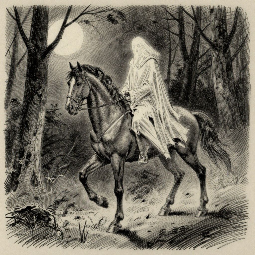 Headless horseman sketch in dark forest, eerie atmosphere, moonlight casting long shadows, detailed horse with flowing mane, ghostly rider with tattered cloak, ink and charcoal style drawing, vintage horror illustration vibe.