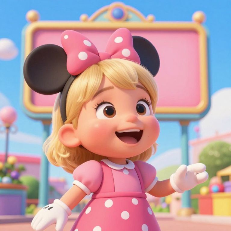 A cheerful female Minnie Mouse wearing a vibrant red and white polka dot dress, complete with a playful, iconic hairstyle and large, expressive eyes. She stands confidently in a sunny park setting, wearing black leggings for a cozy, modern touch and bright red shoes that match her dress. The background features soft green grass, a smiling sun, and a few flowering plants, giving the image a warm, inviting, and lively atmosphere. The style is cartoonish yet detailed, with soft lighting and vibrant colors that highlight her joyful personality.