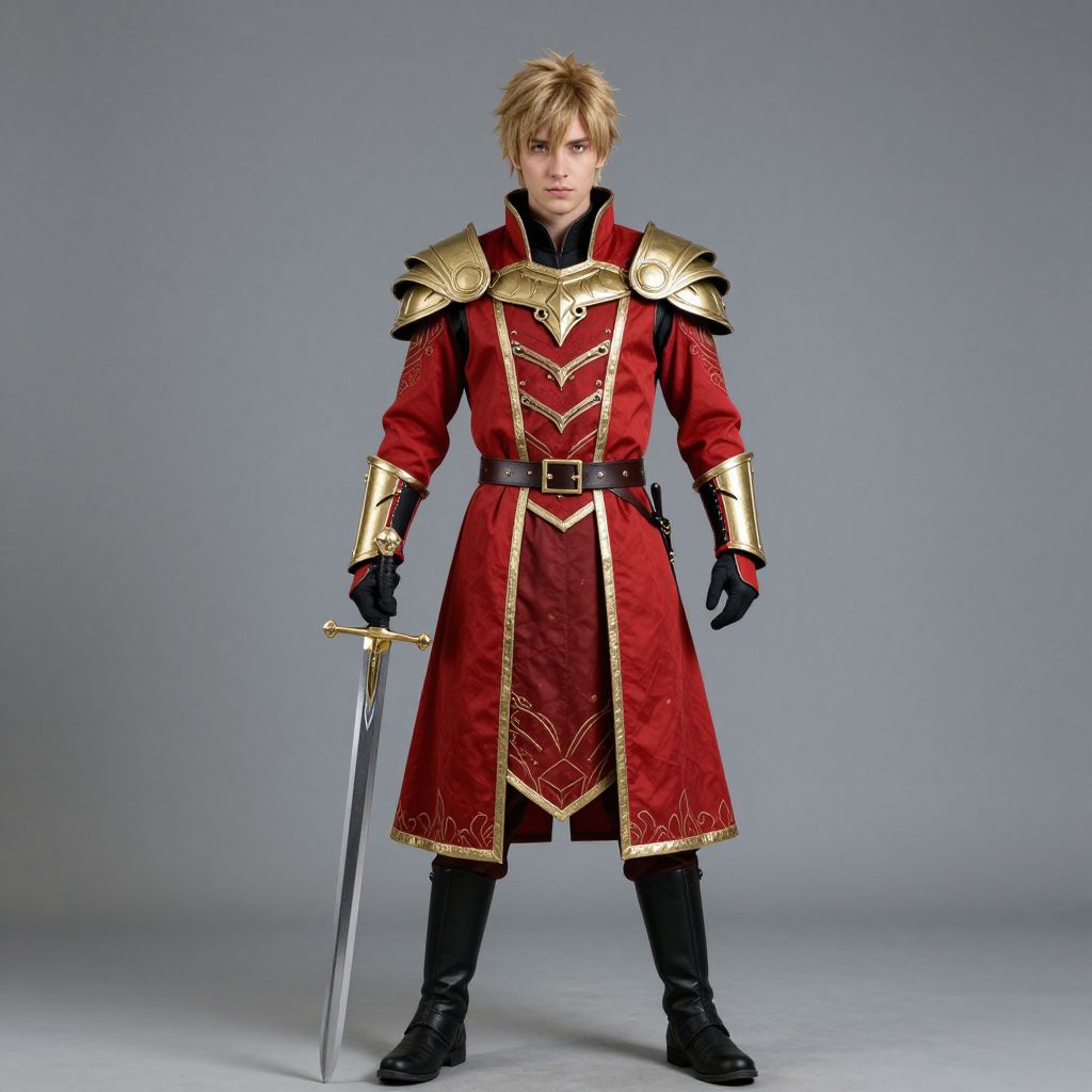 Photograph of a young Caucasian man with tousled blonde hair, standing against a plain gray background. He wears a red medieval-style coat with gold trim and intricate patterns, black gloves, and black boots. His shoulders are adorned with ornate gold pauldrons, and he holds a silver sword with a gold hilt in his right hand. The coat is belted at the waist with a black strap, and the overall appearance is that of a fantasy warrior. The lighting is even, highlighting the textures and colors of his attire.