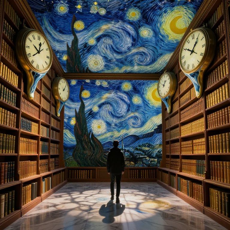 An awe-inspiring image reveals an enigmatic blend of swirling celestial patterns reminiscent of van Gogh's iconic brushstrokes and the surreal melting clocks synonymous with Dali's dreamscapes. Set within the opulent interior of a vast library, the scene captivates the viewer's gaze as they stand amidst towering shelves adorned with golden-hued spines. Above, an intricate celestial map unfolds across the ceiling, its constellations echoing van Gogh's dynamic style while clocks dissolve into nebulous forms that cast whimsical shadows over the polished marble floors. This surreal tableau masterfully combines wonder and introspection, inviting the observer to embark on a journey through time and space within its harmonious visual symphony.
