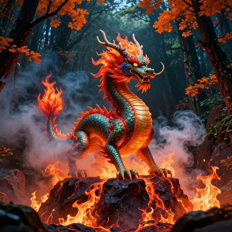 The image depicts a vividly colored, highly detailed Oriental dragon emerging from a fiery, volcanic landscape. The dragon, with its fiery mane and glowing eyes, stands majestically on a rocky outcrop, surrounded by a dramatic, swirling cloud of smoke and flames. The background features a dense, dark forest with trees adorned with vibrant orange leaves, creating a striking contrast with the fiery foreground. The overall composition is dynamic, with the dragon positioned centrally, drawing the viewer's eye through the scene. The interplay of colors, from the fiery reds and oranges to the cool blues and greens, creates a sense of depth and movement, enhancing the dramatic and fantastical atmosphere of the image.