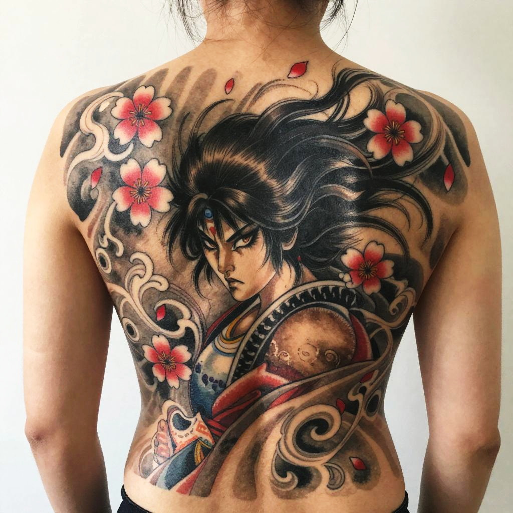Photograph of a person's back showcasing a large, colorful tattoo. The tattoo features a stylized anime character with black, spiky hair and intense eyes, surrounded by swirling black and white patterns. Red cherry blossoms with white centers are scattered throughout. The character, wearing a red and black kimono, is partially obscured by the swirling designs. The skin tone is light brown, and the background is plain white, emphasizing the detailed artwork. The tattoo's style is traditional Japanese with a modern anime influence, blending bold colors and intricate linework.