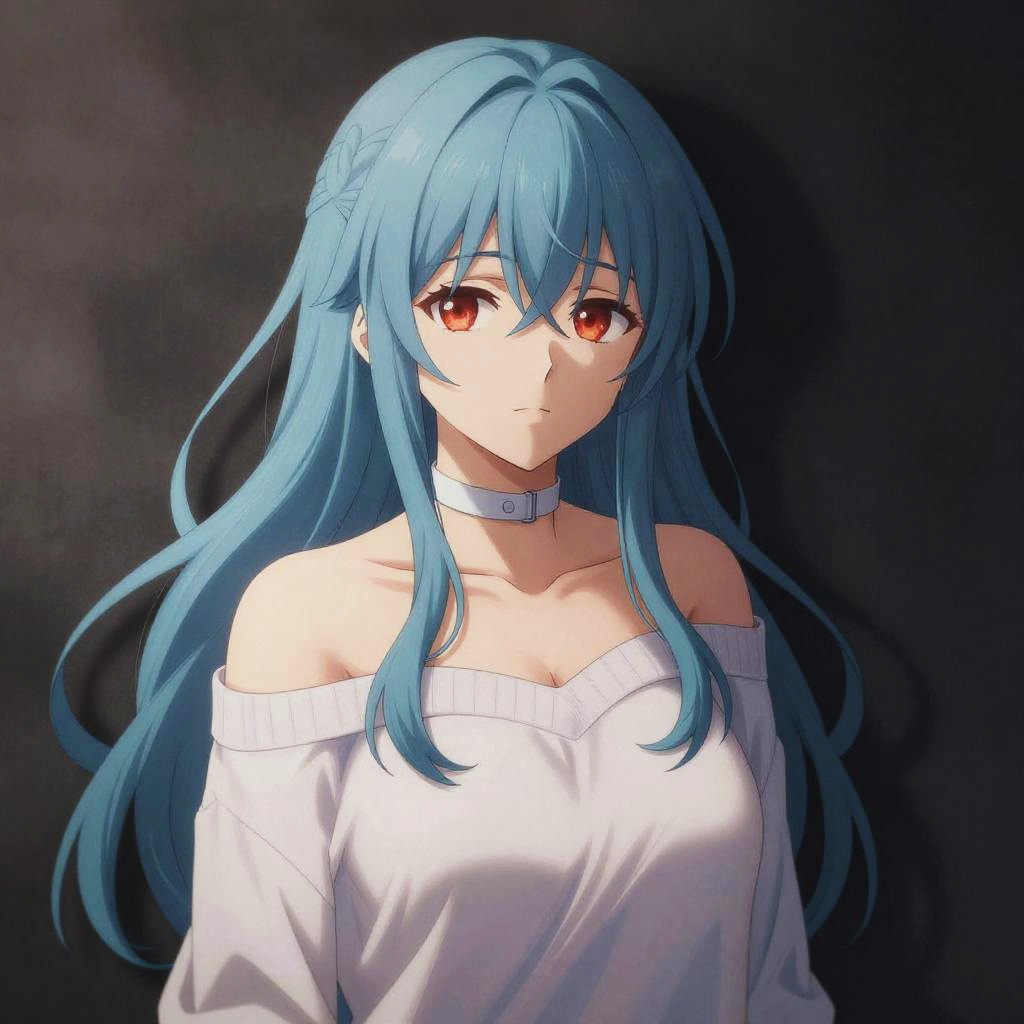 Digital anime-style portrait of a blue-haired girl with red eyes, wearing a white off-shoulder sweater and choker, against a dark background.