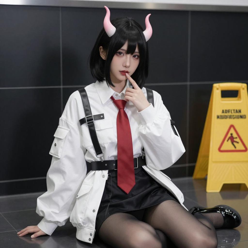 Photograph of an Asian woman with black bob hair and pink horns, wearing a white, oversized, futuristic jacket with black straps, a red tie, black skirt, and sheer stockings. She sits on a reflective floor in a black-tiled room, touching her lips with a finger. The background includes a yellow caution sign.