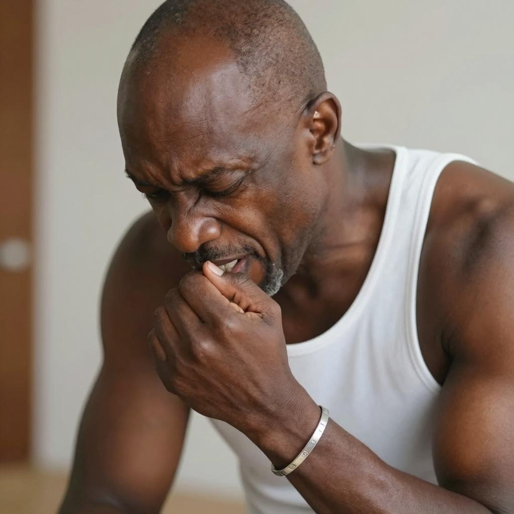 A bald, middle-aged Black man with a close-shaved head, wearing a white tank top and a silver bracelet. He is bending forward, biting his right wrist with intense, concentrated expression. Blurred background. Upper body close-up.