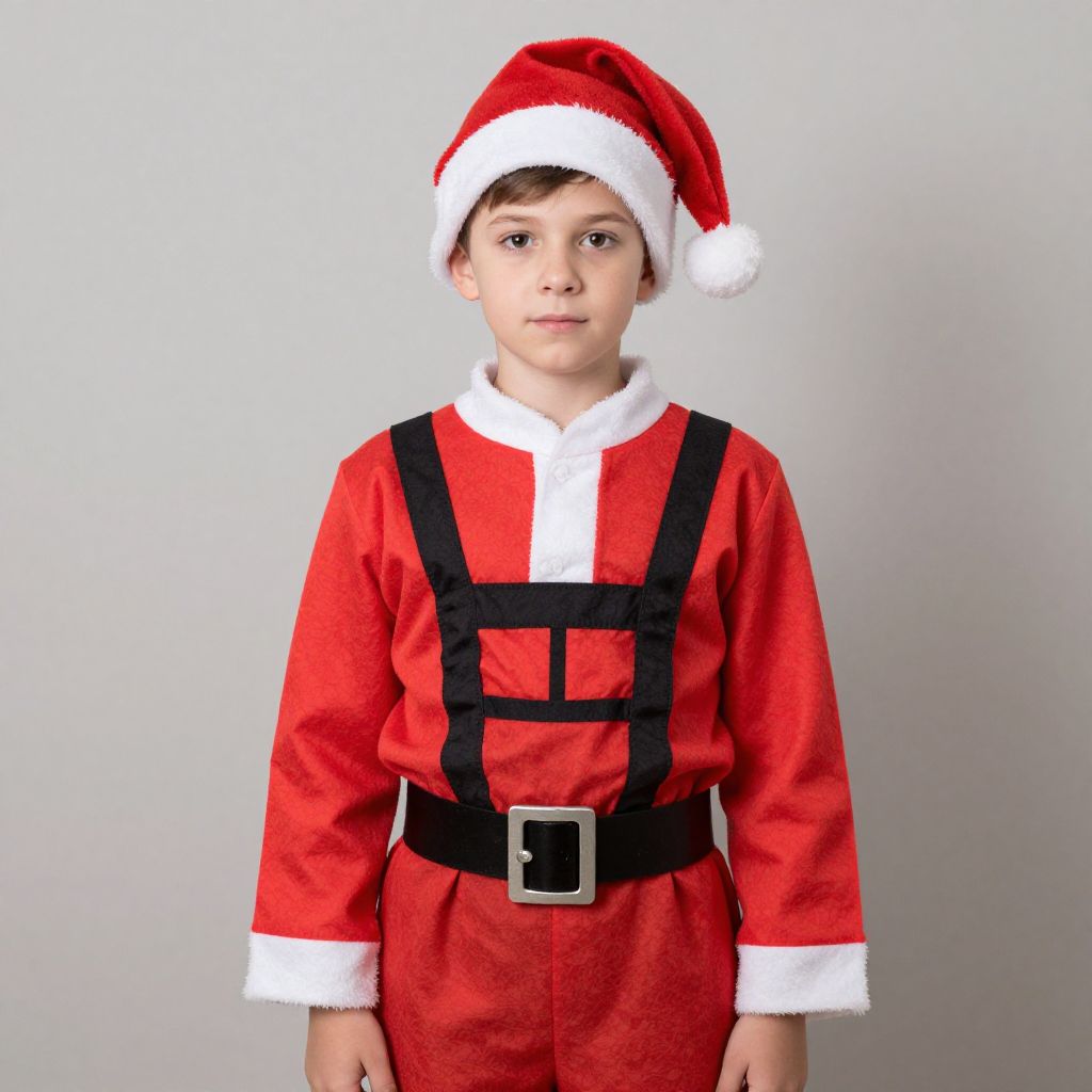 Photograph of a young boy in a red Santa outfit with black straps, white trim, and a Santa hat, standing against a plain white background.