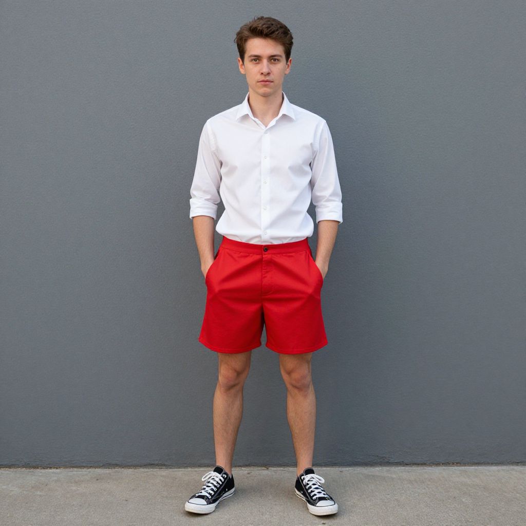 Photograph of a young man with short brown hair, wearing a white button-up shirt, red shorts, black Converse sneakers, standing against a gray