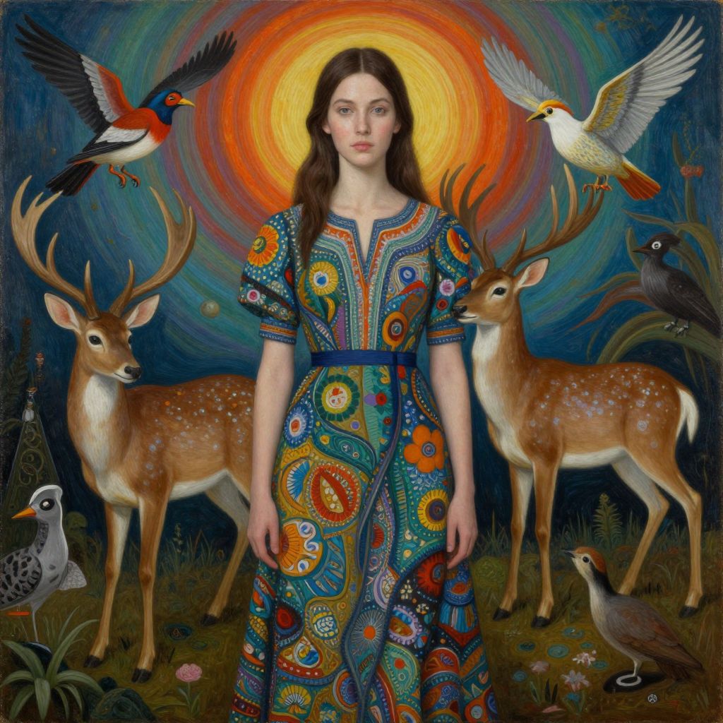 Digital painting of a fair-skinned woman with dark hair, wearing a vibrant, patterned dress, surrounded by deer, birds, and a glowing orange