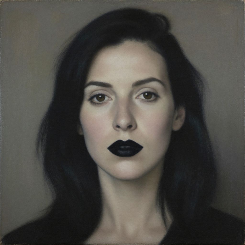 This is a digital portrait of a pale-skinned woman with dark, shoulder-length hair and striking black lipstick. Her eyebrows are dark and well-defined, and her eyes are a muted brown. She gazes directly at the viewer with a neutral expression. The background is a solid, muted gray, providing a stark contrast to her dark features and hair. She is wearing a black top, and the overall style of the portrait is minimalist and slightly gothic, with a focus on her dramatic makeup and expression. The image has a smooth, almost airbrushed texture, enhancing the realistic yet stylized appearance.