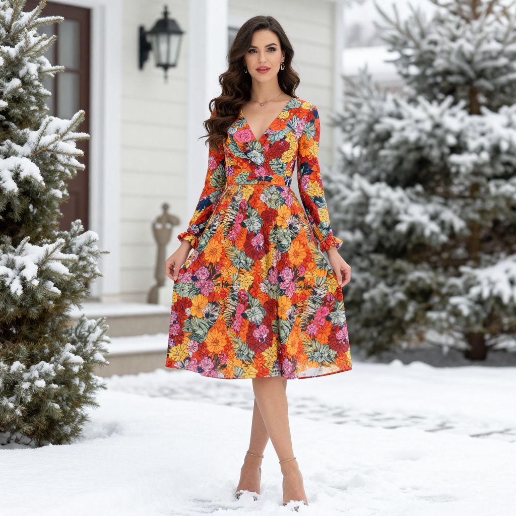 Photograph of a woman with long, wavy dark brown hair standing outdoors in a snowy landscape. She wears a vibrant, knee-length dress with a V-neck and long sleeves, adorned with a colorful floral pattern in shades of orange, red, yellow, and green. Her skin is fair, and she has a slender build. The background features snow-covered pine trees and a white house with a black lantern. The snow on the ground contrasts with her brightly colored dress, creating a striking visual. She stands confidently, with one hand slightly raised, and wears nude-colored high heels.