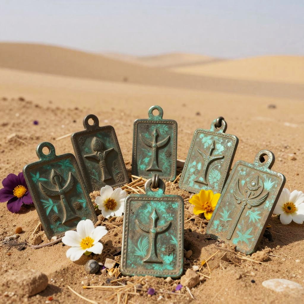Ancient symbols of rebirth engraved on worn bronze amulets scattered among ashes and blooming flowers, symbolizing transformation and renewal in a mystical desert landscape