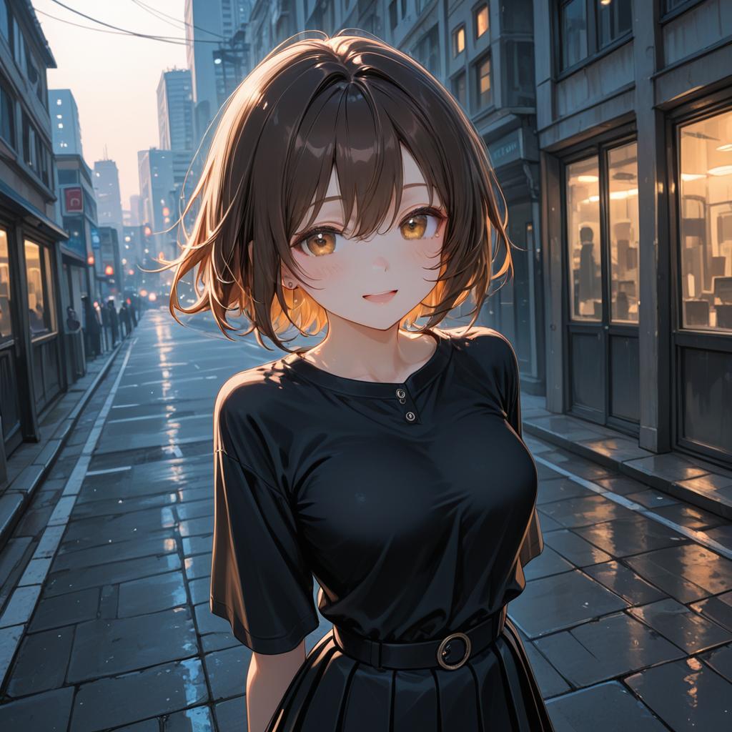 Masterpiece, best quality, highres, ultra-detailed, solo, vivid, slight smile, 1girl, (young teen) short hair, mid-shot, a beautiful girl looking into camera, off shoulder sweater by Chris Foss winter lights, night, off shoulder, outdoor, depth of field, (upper body:0.6)