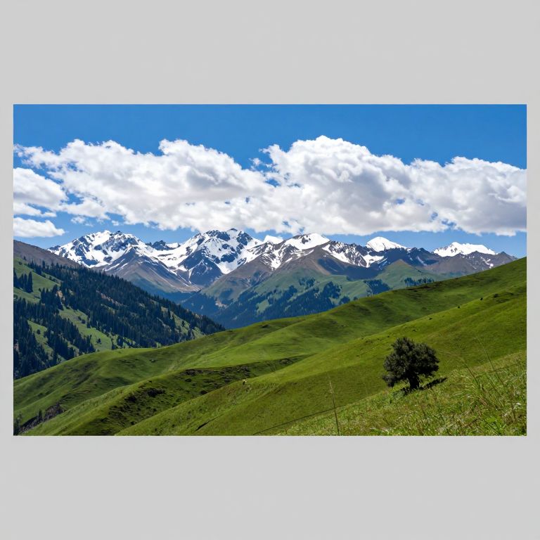 A vibrant photograph of a mountain landscape. The foreground features lush green hills with a small, dark tree on the right. Mid-ground reveals a forested area leading to the base of snow-capped mountains. The background showcases a clear blue sky with fluffy white clouds. The image has a rectangular format with gray borders on the top and bottom.