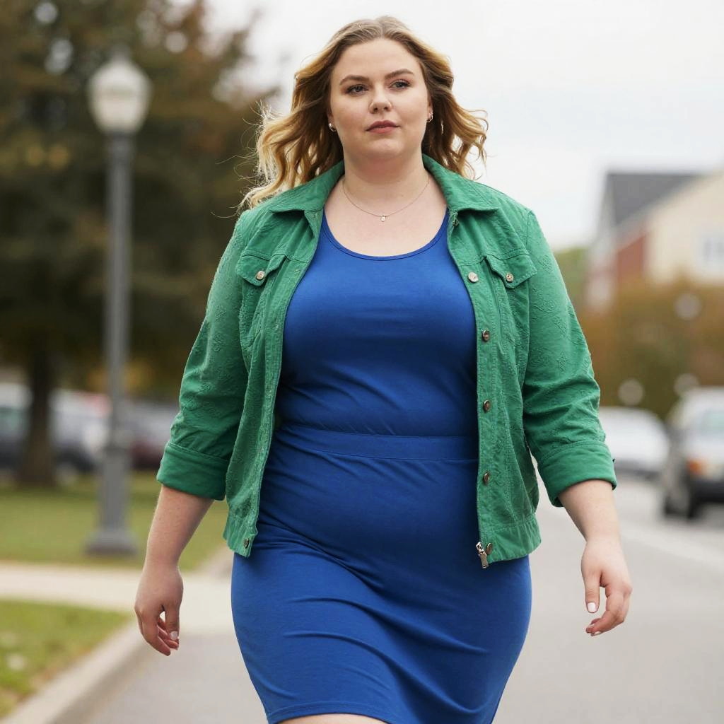Plus size Caucasian woman with blonde hair walking outdoors on a suburban street wearing a fitted blue dress and a green button-up jacket. The woman has a natural makeup look and loose hair, with a calm and focused expression.