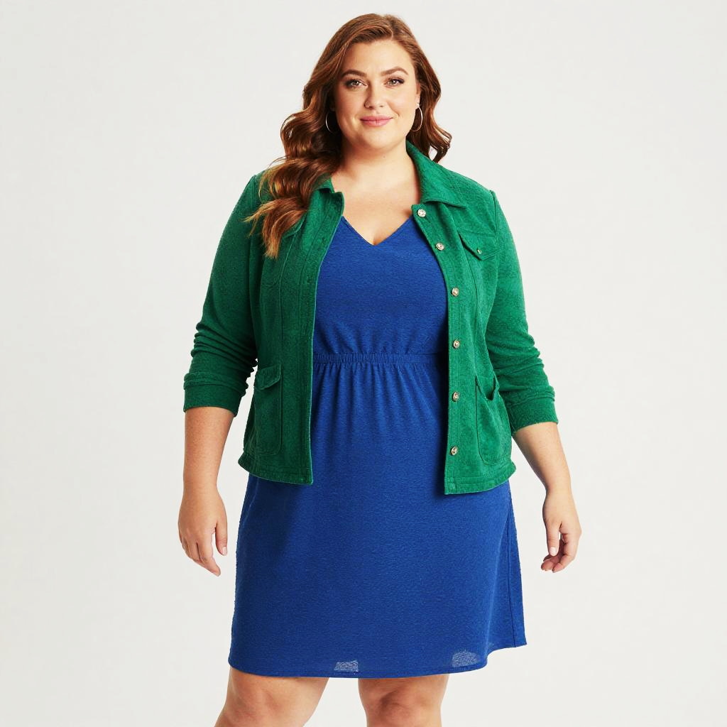 Confident plus size woman in blue dress and green jacket