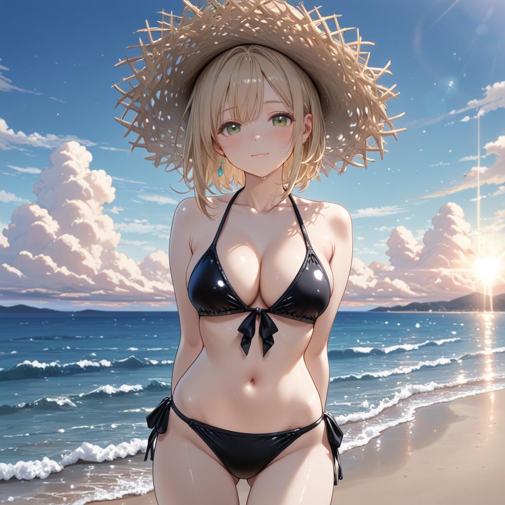 1girl, solo, best quality, masterpiece, twintails, beach, pink hair, micro bikini, areola slip, medium breasts