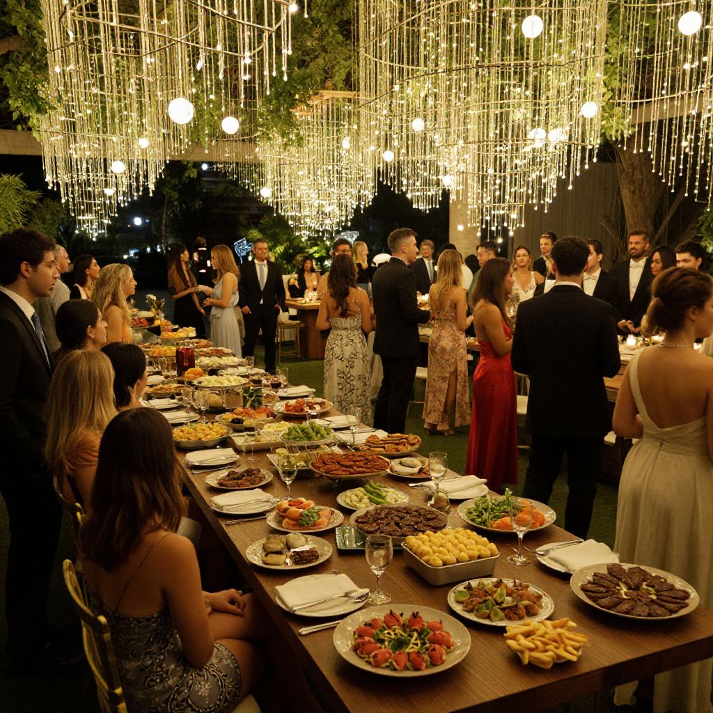 Casadelosfamosos extravagant outdoor party scene at night, elegant guests in formal attire, shimmering decorative lights, gourmet food tables, lively atmosphere, detailed textures, photorealistic style