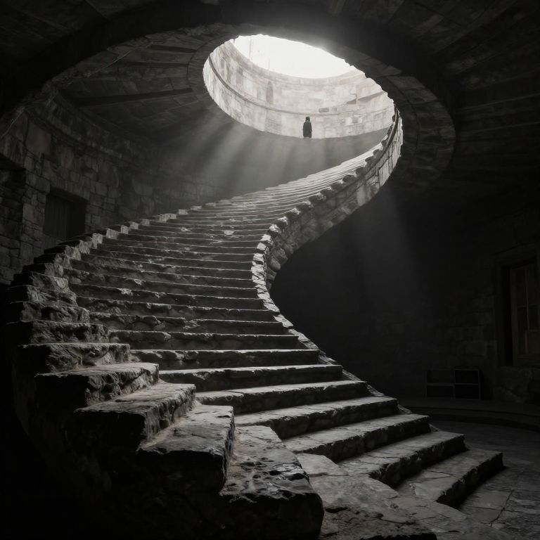 An endless spiral of stone steps ascends toward a radiant light, inviting the solitary traveler into a realm of infinite possibility, where each step dissolves into the void, leaving behind a profound sense of mystery, hope, and existential solitude.