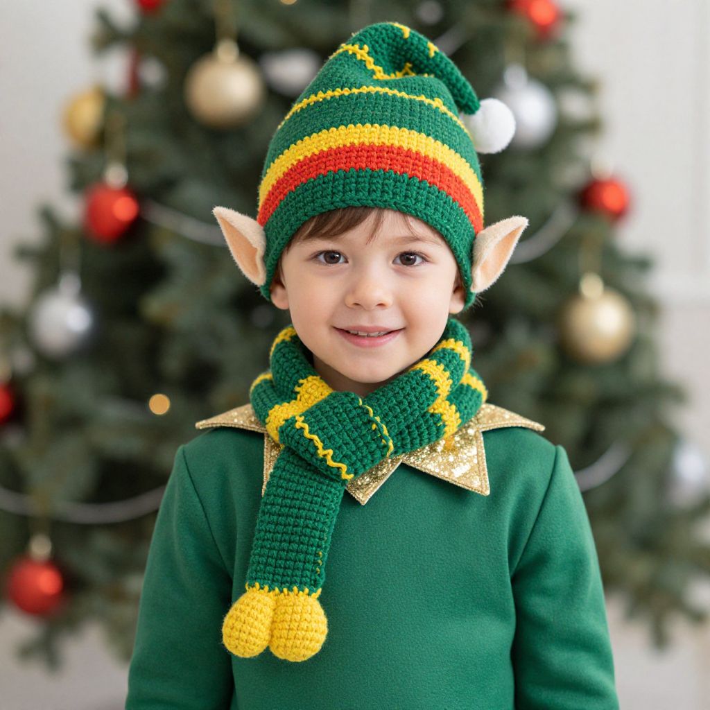 Photograph of a young child with fair skin and brown hair, wearing a green elf costume with pointed ears, a green and yellow striped knit hat, and a matching green and yellow striped scarf with yellow pom-poms. The child has a cheerful expression and is dressed in a green long-sleeve shirt with a gold-trimmed collar. In the background, there is a blurred Christmas tree adorned with red and gold ornaments, creating a festive atmosphere. The image is brightly lit, highlighting the child's face and costume.