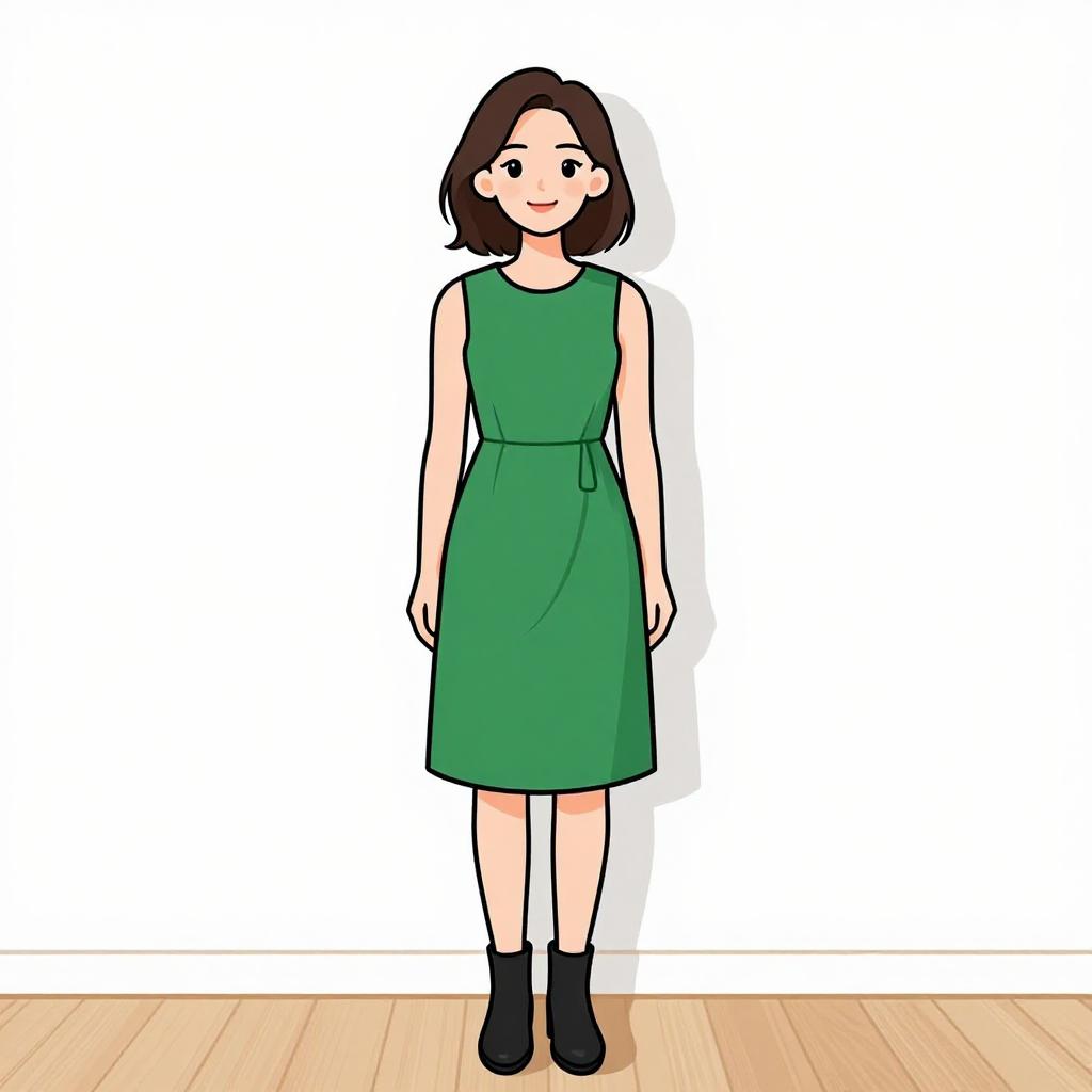 Digital drawing of a cute, smiling Asian woman with short black hair, wearing a green sleeveless dress and black ankle boots, standing on wooden floor against