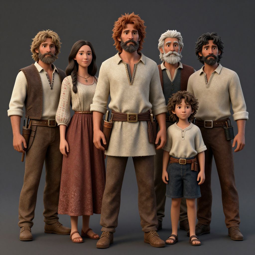 Digital CGI family portrait of six people with rustic, ancient-style clothing and beards, standing against a dark gradient background.
