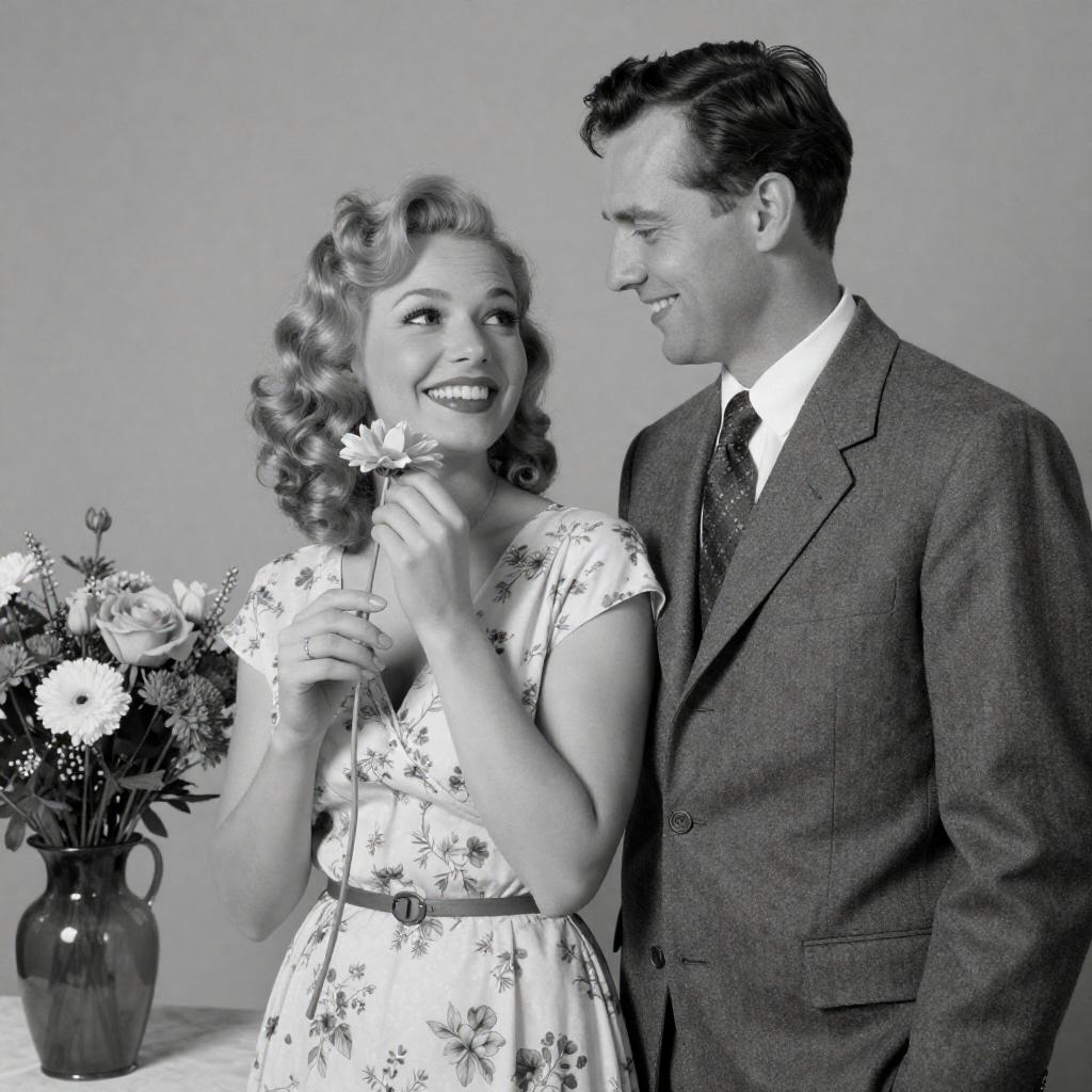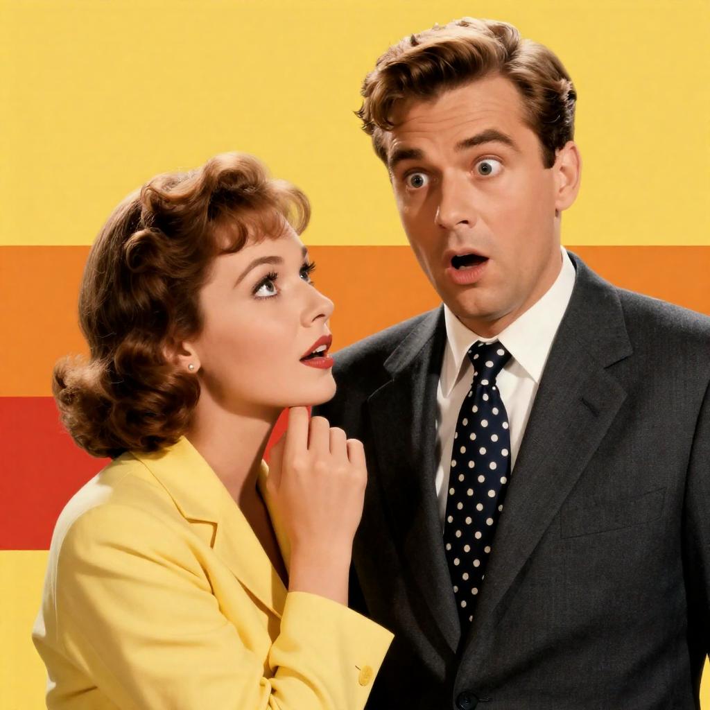Vintage movie poster featuring a shocked man in a dark suit with a polka-dot tie, and a woman with short brown hair in a yellow jacket, looking up at him. Bright yellow and orange background with bold red and blue . The man's mouth is open in surprise, and the woman rests her chin on her hand.