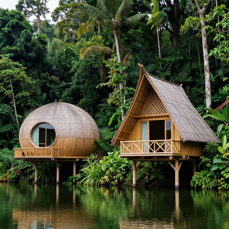 The image depicts a beautiful and unusual tropical resort of bamboo tree houses, nestled in a lush, verdant jungle. Two distinct tree houses stand prominently, one round and the other more angular, both constructed from natural materials and blending seamlessly with the surrounding environment. The round tree house, with its smooth, curved surface and large, circular windows, is situated to the left, while the angular tree house, featuring a pointed roof and intricate lattice work, is positioned to the right. Both structures are elevated on stilts, surrounded by a calm, reflective body of water that mirrors their forms, enhancing the serene and idyllic atmosphere. The dense foliage of the jungle envelops the area, with tall trees and dense undergrowth creating a sense of seclusion and tranquility. The overall composition is harmonious, with the tree houses and the natural elements interacting in a balanced and aesthetically pleasing manner, evoking a sense of harmony with nature.